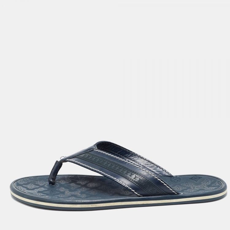 Louis Vuitton Navy Blue Leather and Logo Embossed Rubber Thong Flats Size 45
