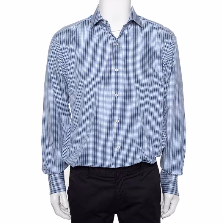 مملوكة مسبقًا قميص توم فورد أزرار أمامية قطن نمط كحلي وأبيض مقاس كبير جدا