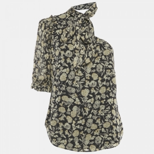 بلوزة بولو رالف لورين بطبعة زهور سوداء من الشيفون بكتف واحد مقاس كبير - لارج
