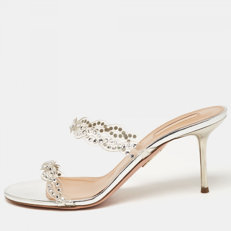Aquazzura Transparent PVC and Crystal Embellished Strappy Slide Sandals Size 38