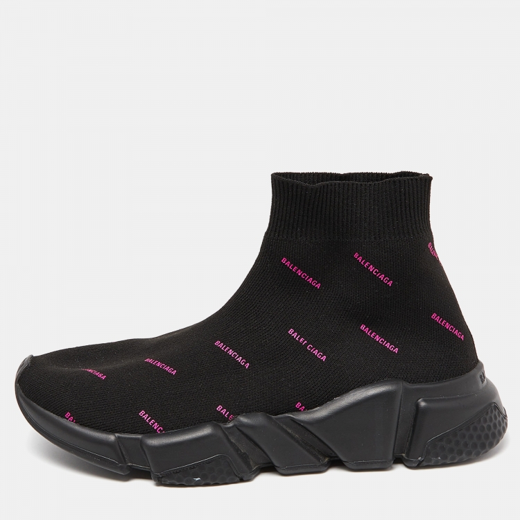 Pre Owned Balenciaga Black/Pink Logo Print Knit Fabric Speed Trainer Sneakers Size 37