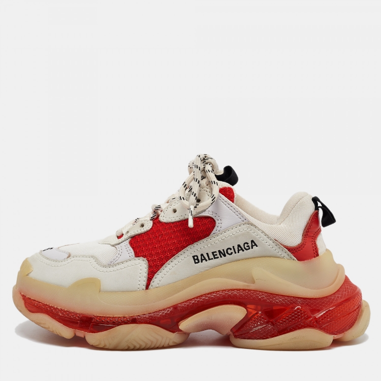حذاء رياضي بالنسياغا جلد وشبك أبيض/أحمر نعل شفاف ثلاثي المقاس 36