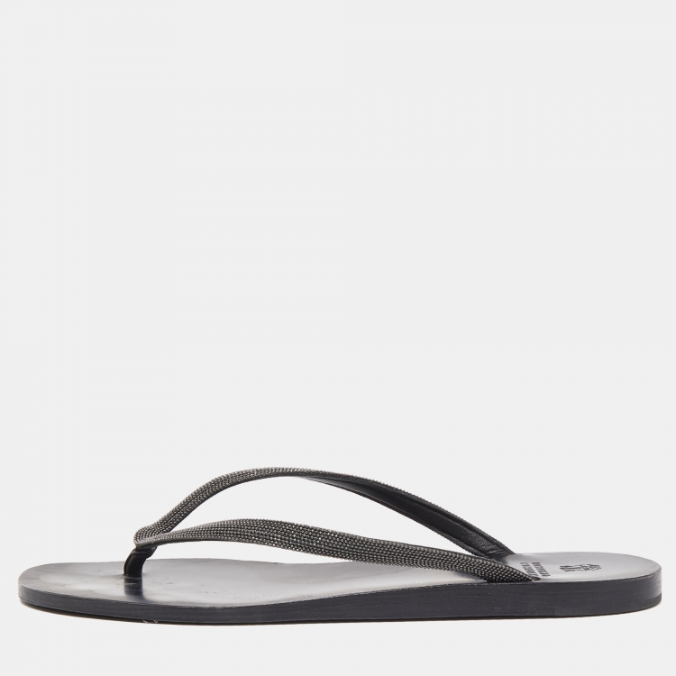 Brunello Cucinelli Black Glitter Monili Thong Slide Flat Size 40