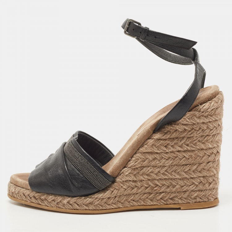 Brunello Cucinelli Black Leather Ankle Strap Wedge Sandals Size 40