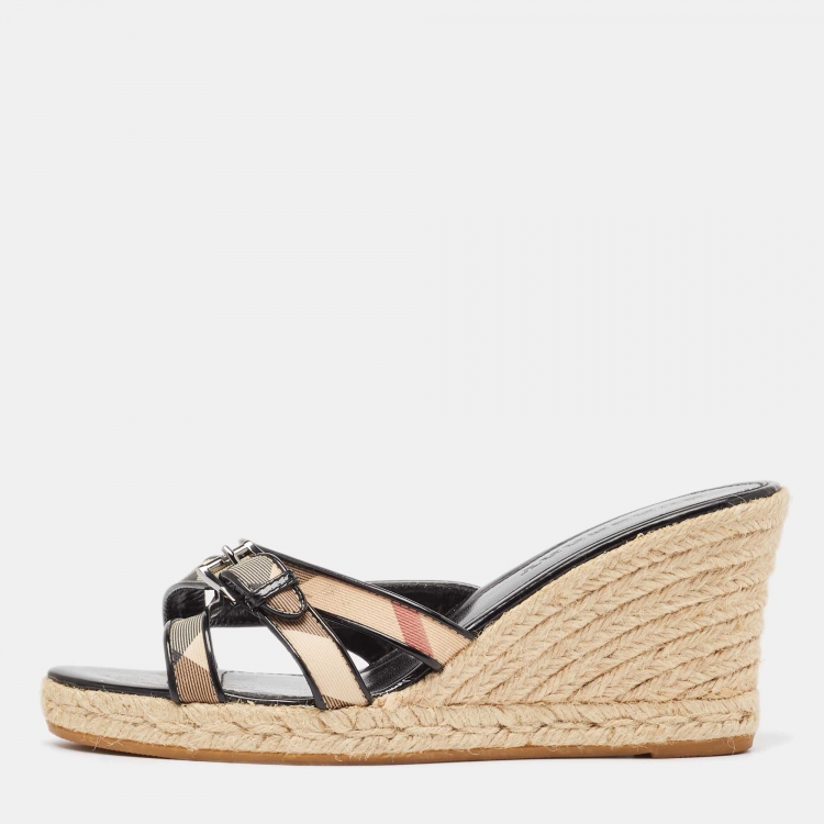 Burberry Beige/Black House Check Canvas and Patent Wedge Sandals Size 40
