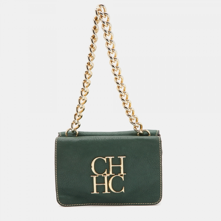 CH Carolina Herrera Green Leather Double Flap Chain Baguette Bag