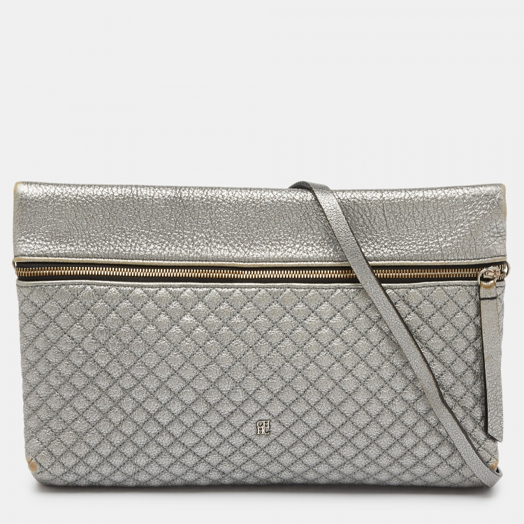 CH Carolina Herrera Metallic Silver Quilted Leather Front Zip Crossbody Bag