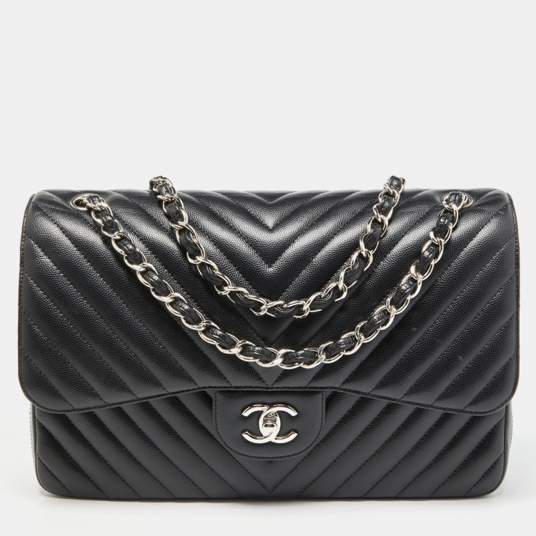 حقيبة يد شانيل جامبو كلاسيك جلد كافيار شيفرون مبطن أسود