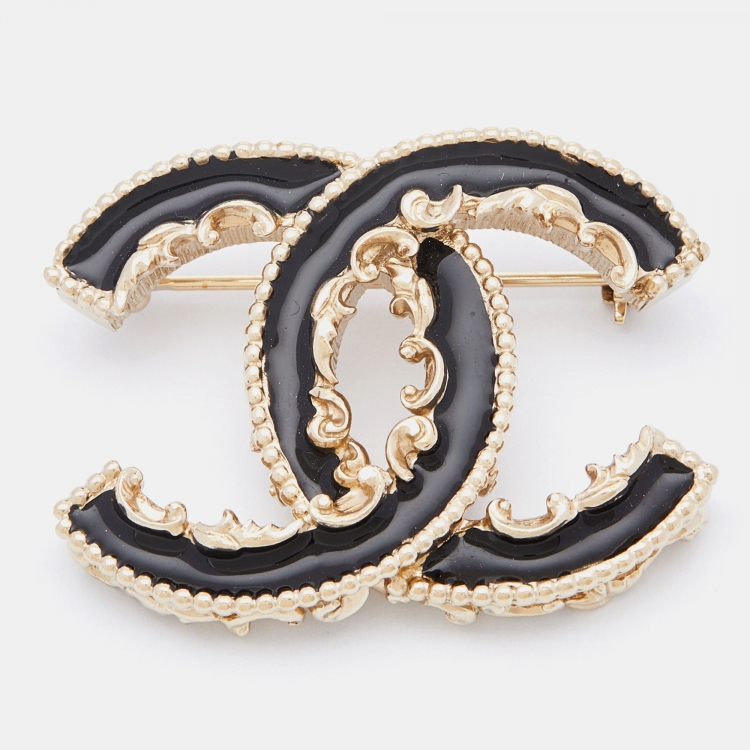 Chanel Black Enamel Gold Tone CC Baroque Pin Brooch