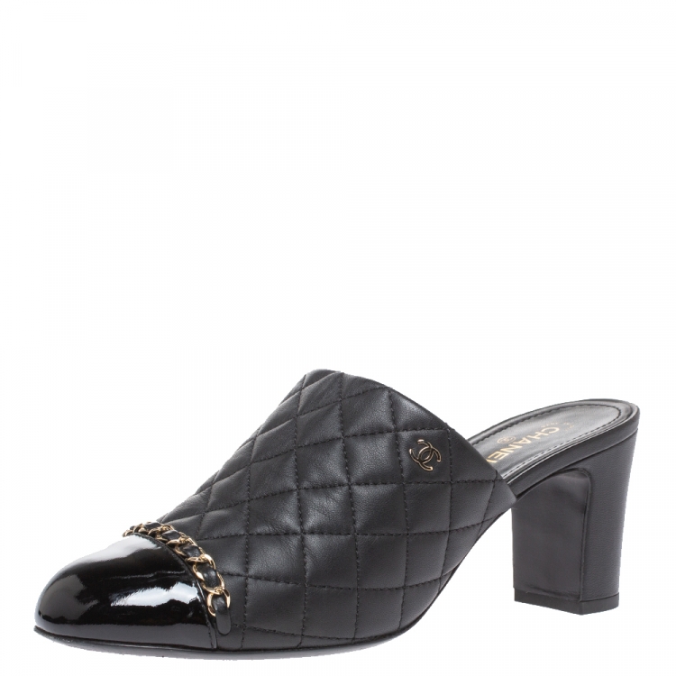 Pre Owned حذاء مولز شانيل كعب أسود تفاصيل سلسلة جلد مبطن أسود مقاس 39.5