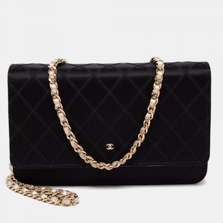 Pre Owned محفظة بسلسلة شانيل كلاسيك جلد وساتان مبطن ذهبي/أسود بقلاب