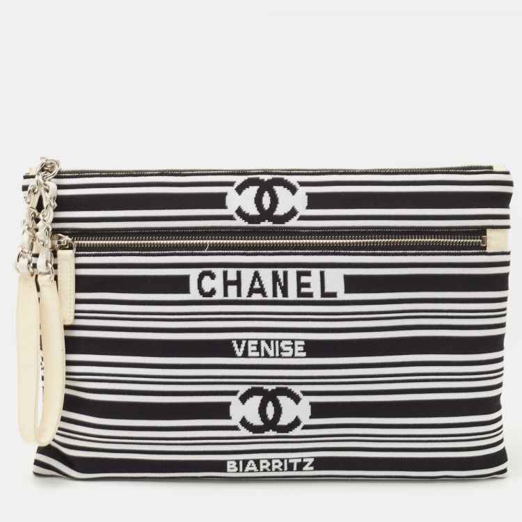 Chanel Black/White Stripe Fabric and Leather Zip Wristlet Clutch