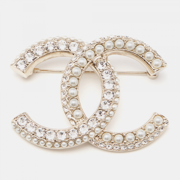 Chanel CC Faux Pearl Crystals Gold Tone Brooch