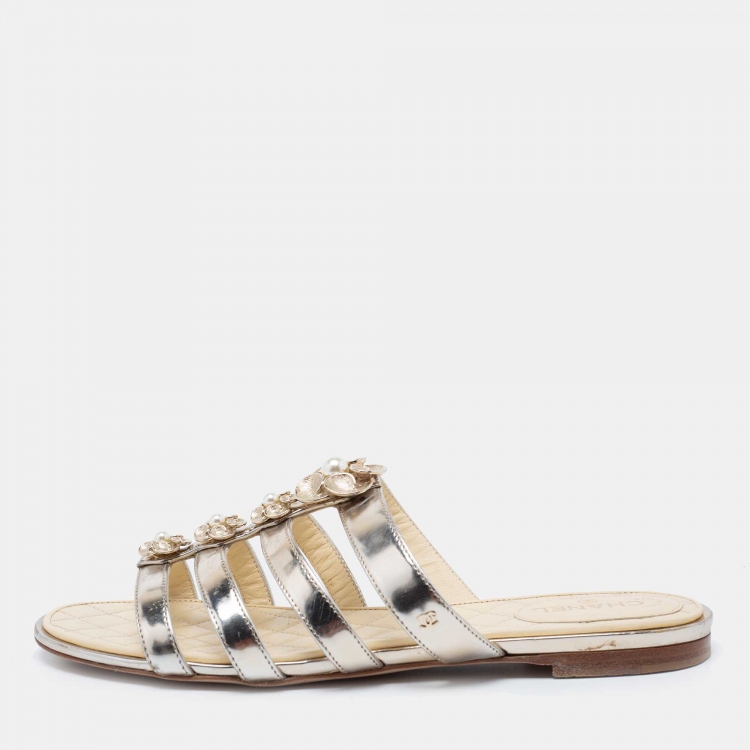 حذاء سلايدز شانيل فلات جلد ذهبي فاتح مرصع بالؤلؤ صناعي شكل زهور مقاس 38