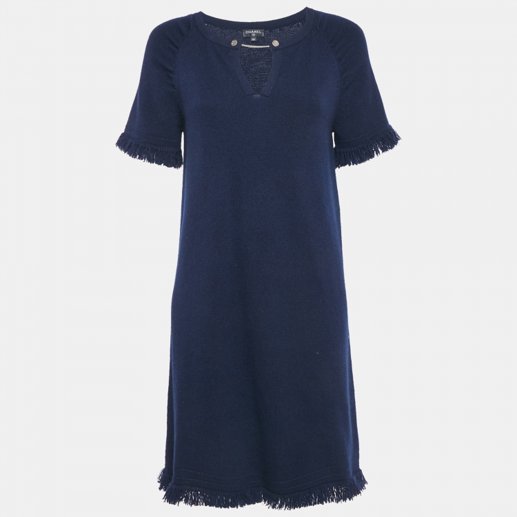 فستان شانيل أزرق بحري كشمير منسوج بشراشيب قصير متوسط