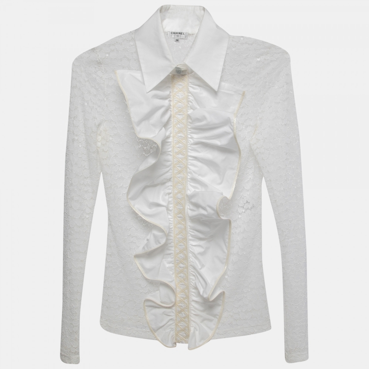 Pre Owned Chanel White Lace Ruffled Blouse S