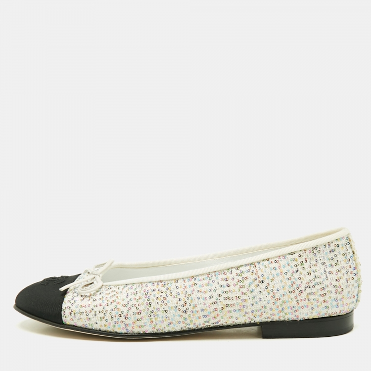 حذاء باليرينا فلات شانيل مزين شعار الماركة CC مقدمة سوداء مزين فيونكة قماش تويد و جلد مونوكرومي مقاس 41