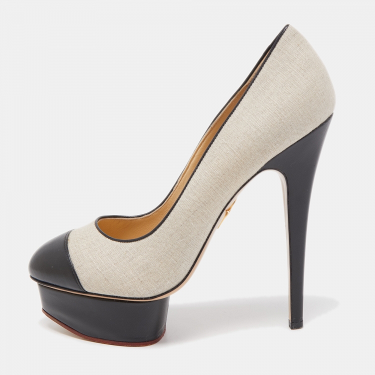 Charlotte Olympia Black/Beige Canvas and Leather Dolly Platform Pumps Size 39
