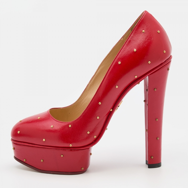 مملوكة مسبقًا Charlotte Olympia Red Leather Studded Block Heel Platform Pumps Size 37