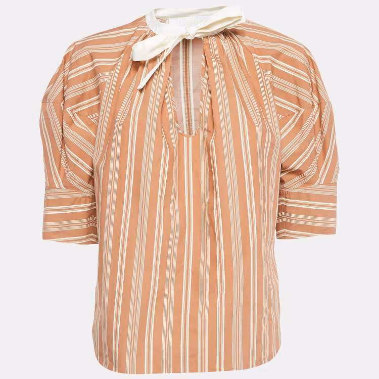 مملوكة مسبقًا توب كلوي حرير عنق مربوط مطبوع بخطوط بنية مدرج M