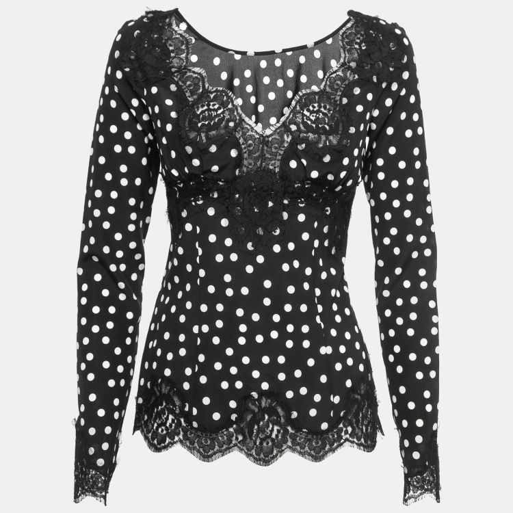 Dolce & Gabbana Black Polka Dotted Silk Lace Trimmed Long Sleeve Blouse S