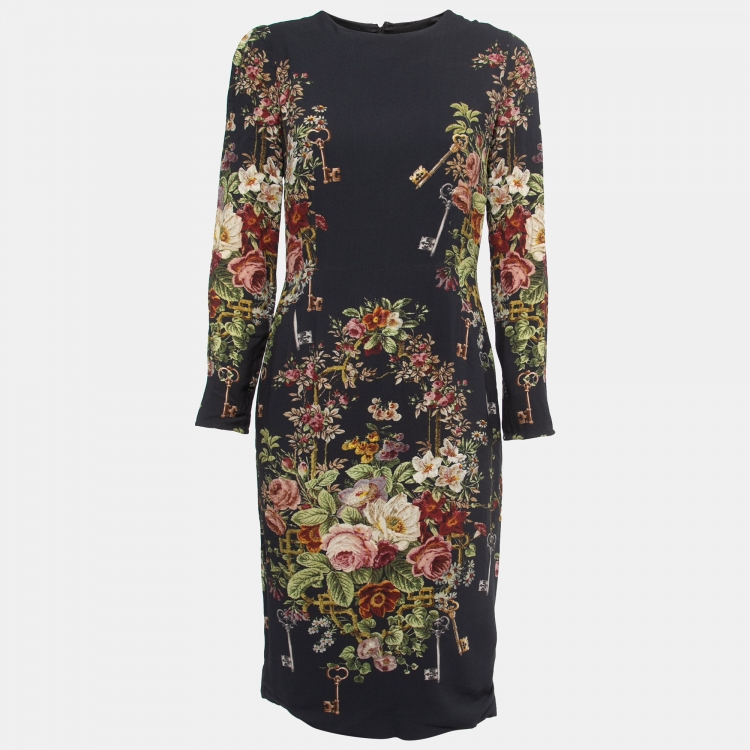 Dolce & Gabbana Navy Blue Floral Printed Crepe Long Sleeve Midi Dress L
