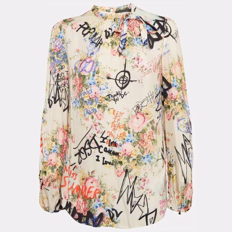 مملوكة مسبقًا توب دي سكويرد2 تفاصيل ربط طباعة جرافيتي وزهور أبيض مائل متوسطة