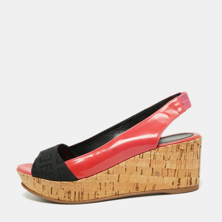 صندل فندي جلد لامع وكانفاس زوكا أسود / وردي نعل سميك روكي فيلين فتحة كعب مقاس 37.5