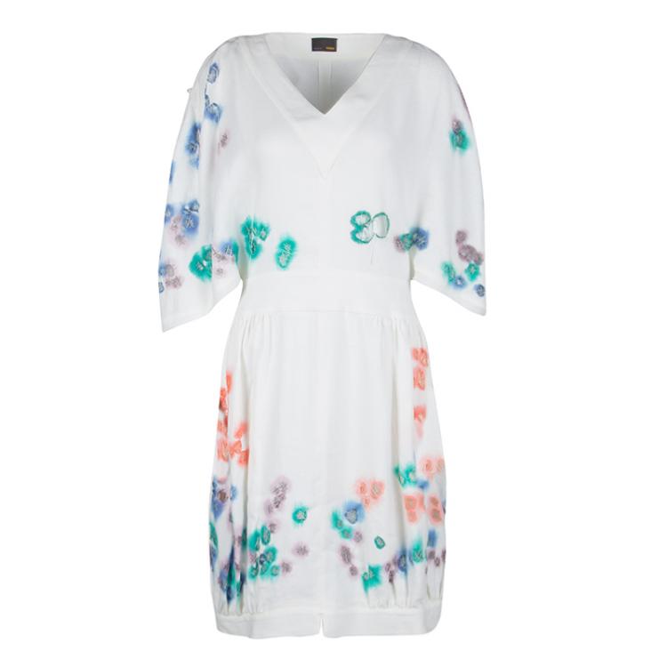 Pre Owned فستان فندي كتان أبيض تفريغات مزينة رقبة حرف V مقاس S