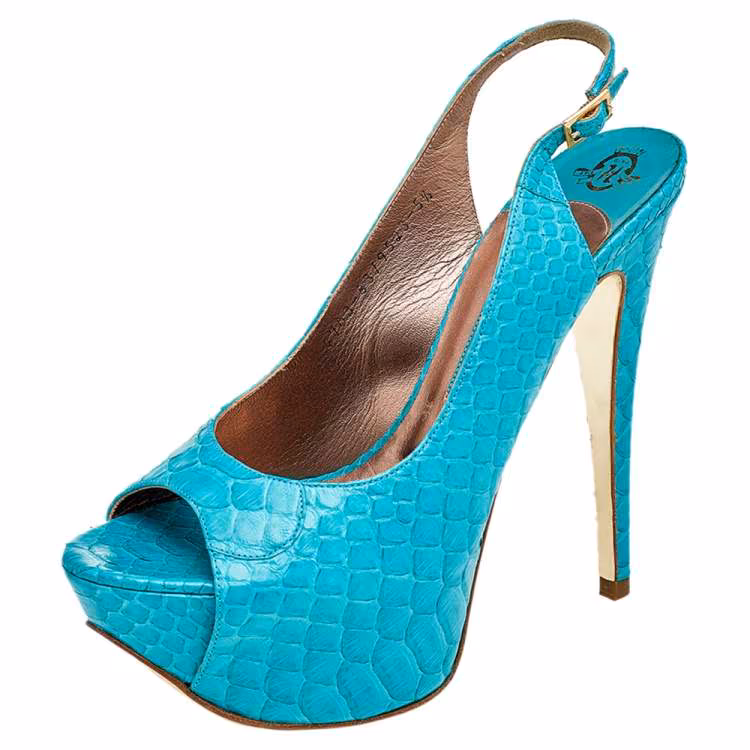 Pre Owned صندل جينا جلد ثعبان أزرق مقدمة مفتوحة نعل سميك فتحة كعب مقاس 38.5