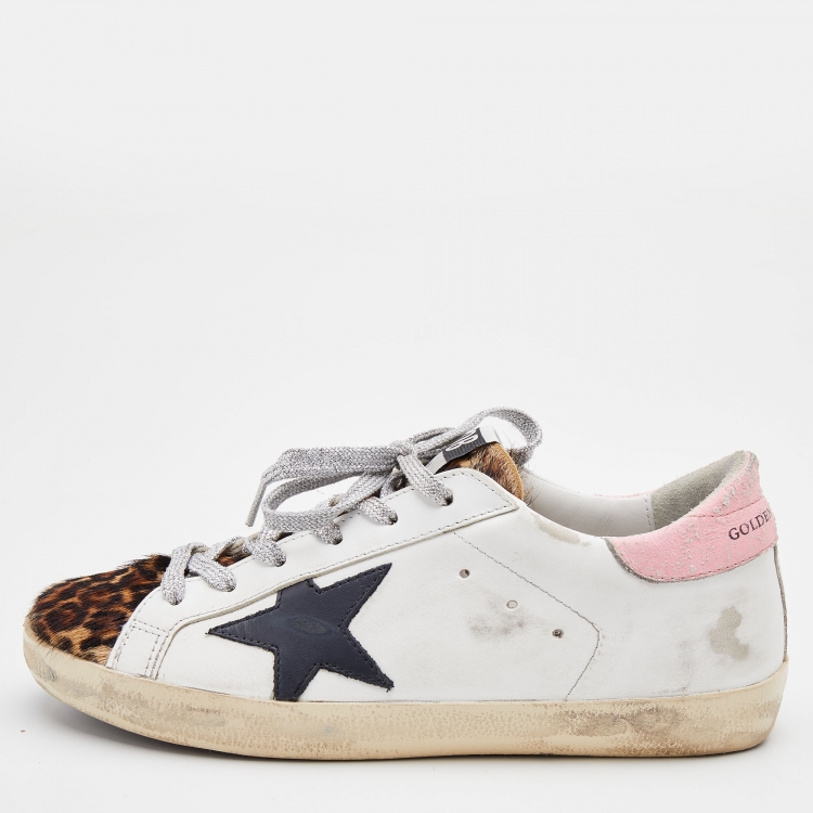 Pre Owned Golden Goose White/Pink Leather and Leopard Print Calf Hair Hi Star Sneakers Size 37