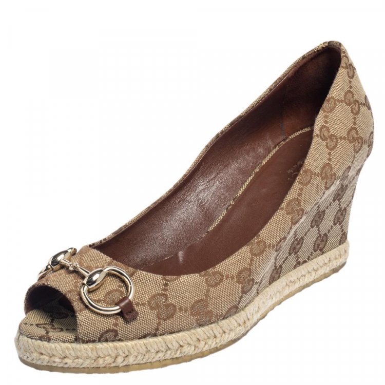 Pre Owned حذاء كعب عالي غوتشي شارلوت مزين هورسبيت كعب روكي إسبادريل مقدمة مفتوحة كانفاس جي جي بيج ميتاليك مقاس 39.5