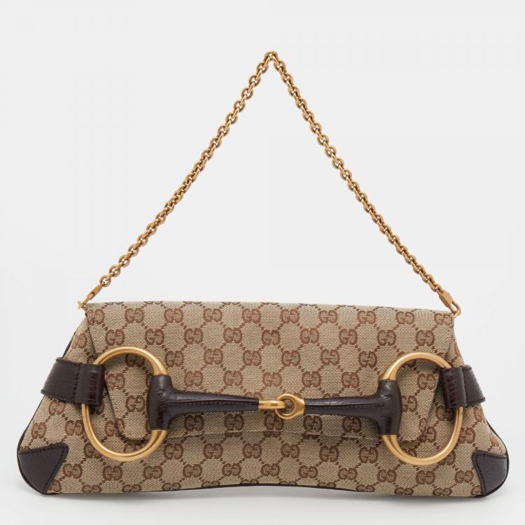Pre Owned حقيبة كلتش غوتشي هورسبيت جلد وكانفاس جي جي بيج/بني بسلسلة