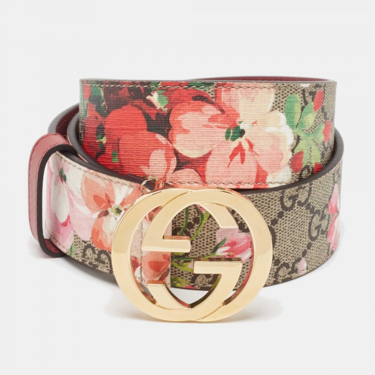 حزام غوتشي كانفاس طباعة زهور سوبريم GG بيج/وردي إبزيم G متشابك 90 سم