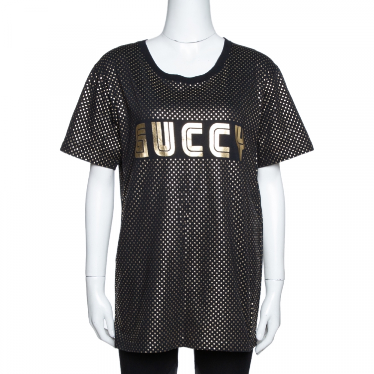مملوكة مسبقًا تي شيرت غوتشي رقبة مستديرة مزين "غوتشي" و مطبوع نجوم ذهبي و أسود مقاس صغير (سمول)