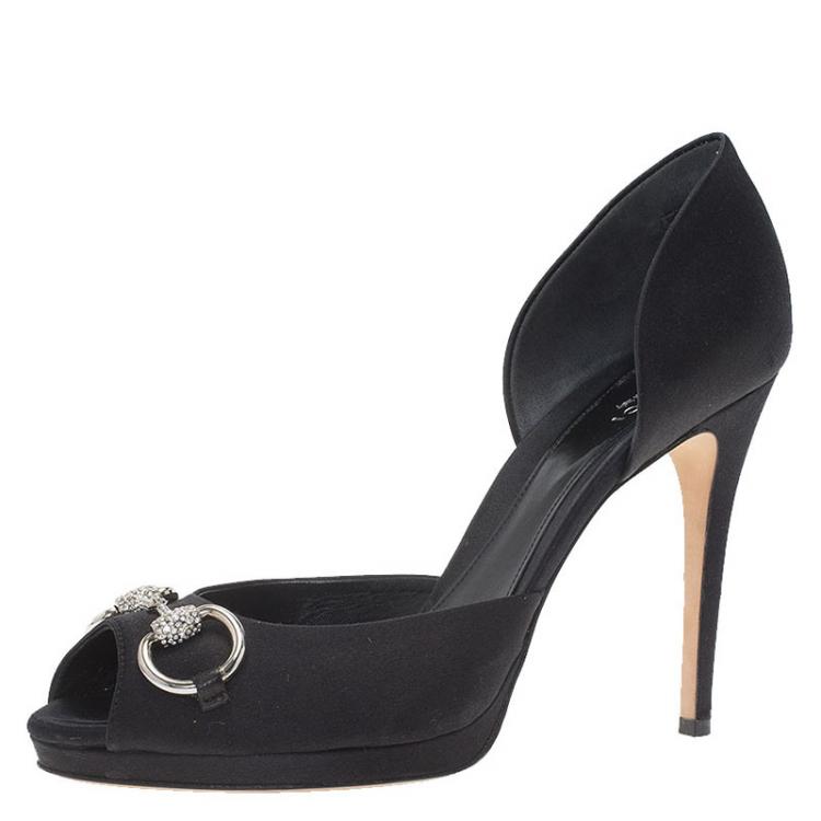 حذاء كعب عالي غوتشي دورساي ساتان أسود إكسسوار هورسبيت كريستال مقاس 39