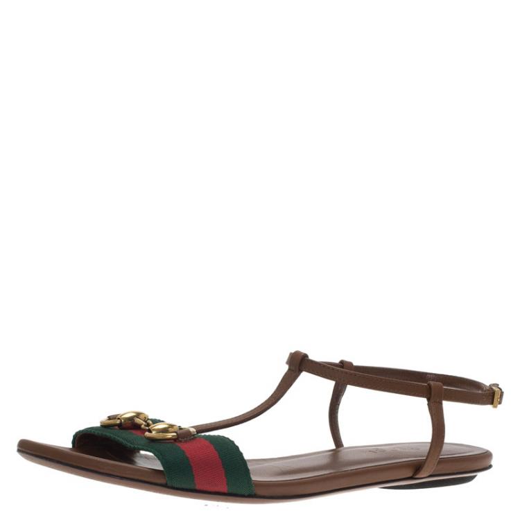 Pre Owned صندل فلات غوتشي ليليانا جلد بني بنمط الويب المزين مقاس 36.5