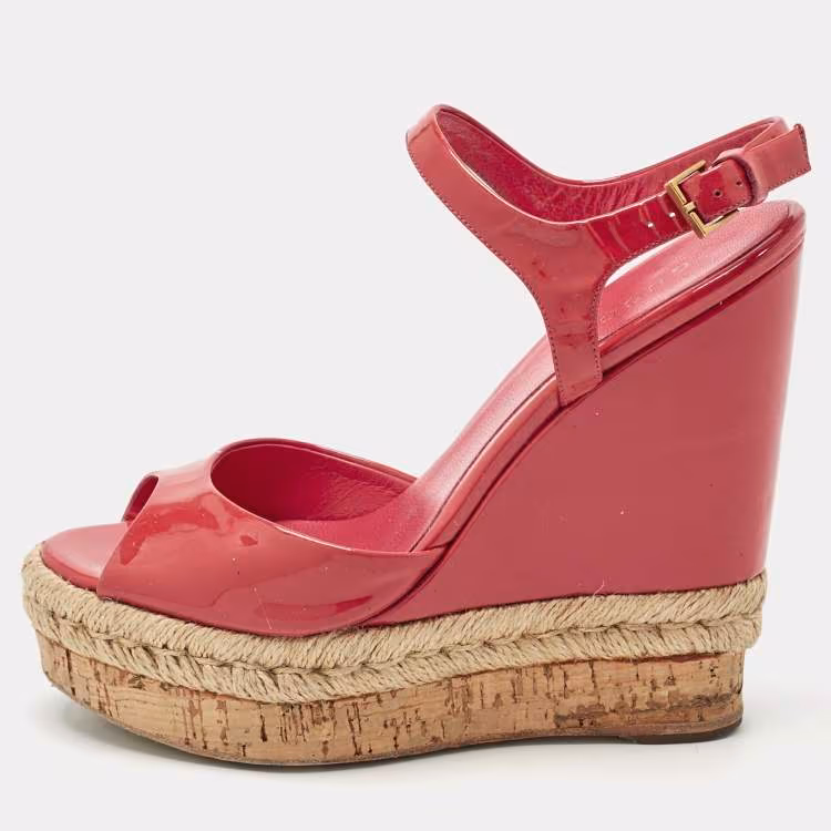 مملوكة مسبقًا صندل غوتشي إسفين جلدي لامع بلون أحمر مرجاني مقاس 35