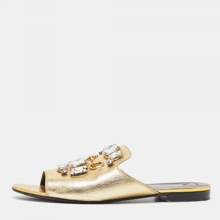 Gucci Gold Leather Crystal Embellished Horsebit Flat Slides Size 39