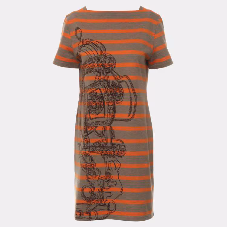 فستان هيرمس قطن مخطط بني برتقالي مقاس نسائي فرنسي 40