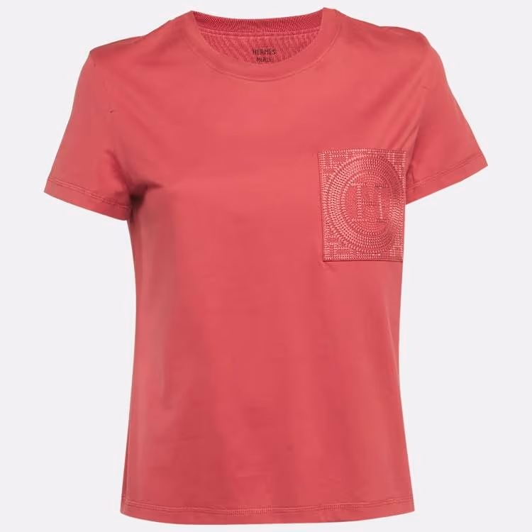 Pre Owned تي شيرت هيرمس جيرسي وردي جيب مطرز مقاس متوسط (ميديم)