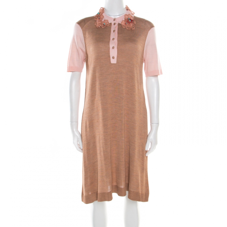 فستان قميصي لوي فيتون بولو أبليك خرز وزهور تريكو حرير بيج L