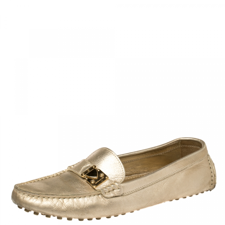 مملوكة مسبقًا حذاء لوفرز لوي فيتون سليب أون قفل حرف أس جلد ذهبي ميتالك مقاس 38