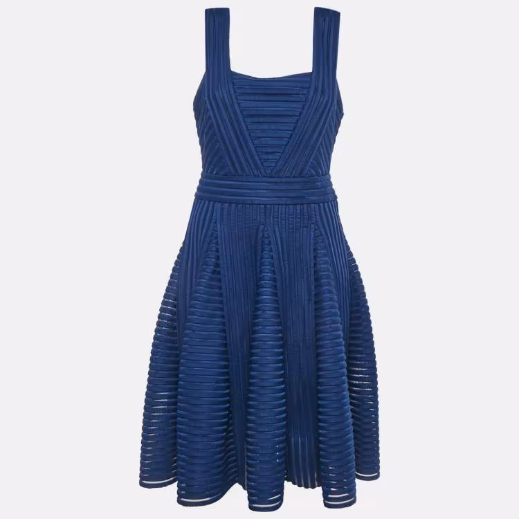 مملوكة مسبقًا فستان قصير بلا أكمام من جيرسي وشبكة مخطط باللون الأزرق البحري من ماج مقاس كبير - لارج