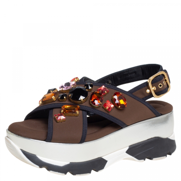 مملوكة مسبقًا صندل قماش بني مزخرف جواهر سيور متعاكسة نعل سميك مقاس 39