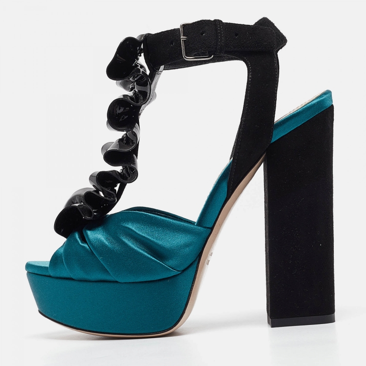 Pre Owned صندل ميو ميو سير كاحل ساتان وجلد سويدي أسود/أخضر مقاس 35