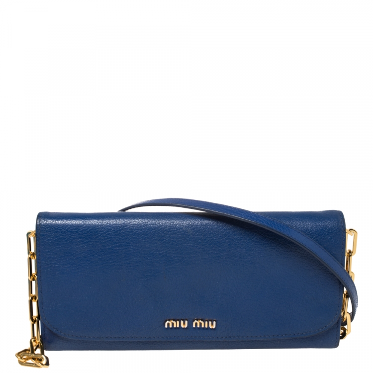 محفظة ميو ميو جلد مادراس أزرق بالشعار قلاب وسلسلة
