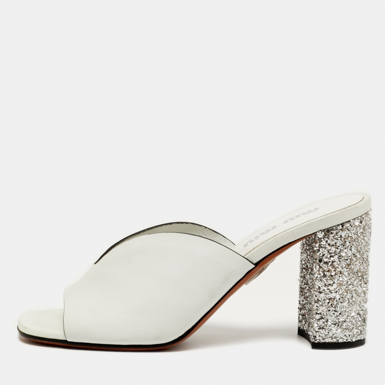 مملوكة مسبقًا صندل ميو ميو جلد أبيض كعب عريض منزلق مقاس 38