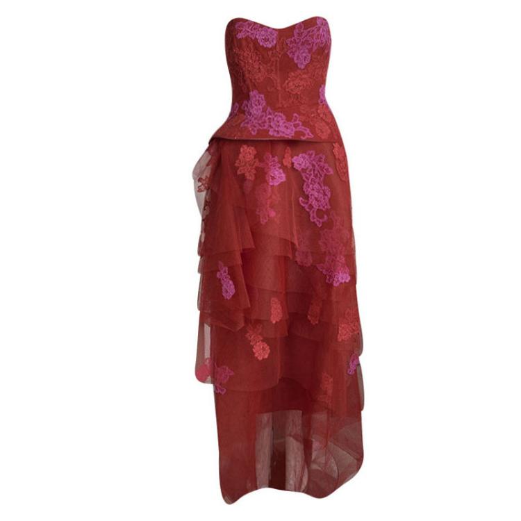 Pre Owned فستان مونيك لولييه بيبلوم طبقات بلا حمالات شبك زخرفة زهور أحمر S