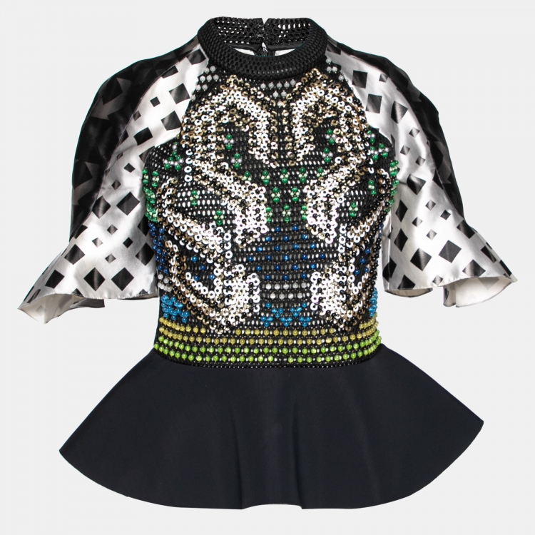 Pre Owned توب بيتر بيلوتو بيبلوم قطن كاروهات أسود مطبوع بأكمام بكرانيش مقاس وسط ( ميديوم )